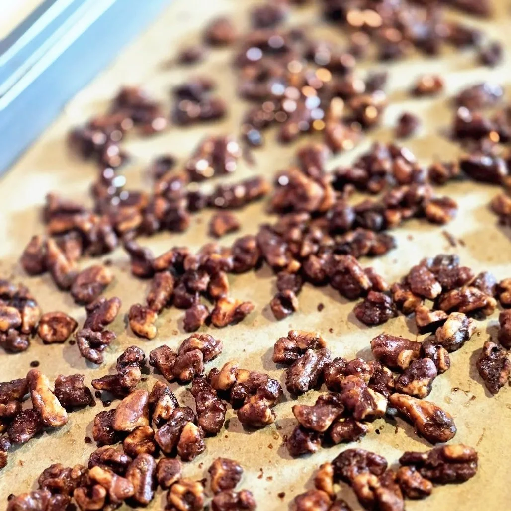 /These roasted maple walnuts with spices are a great topper for multiple holiday recipes. We used them over our Holiday Pear & Smoked Trout Salad.