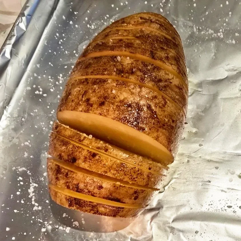 Cut the potato in thin slices being careful no to cut completely through the bottom so it stays intact. Drizzle with olive oil and sprinkle with salt. Put it in preheated 400 (f) oven for 30 minutes.