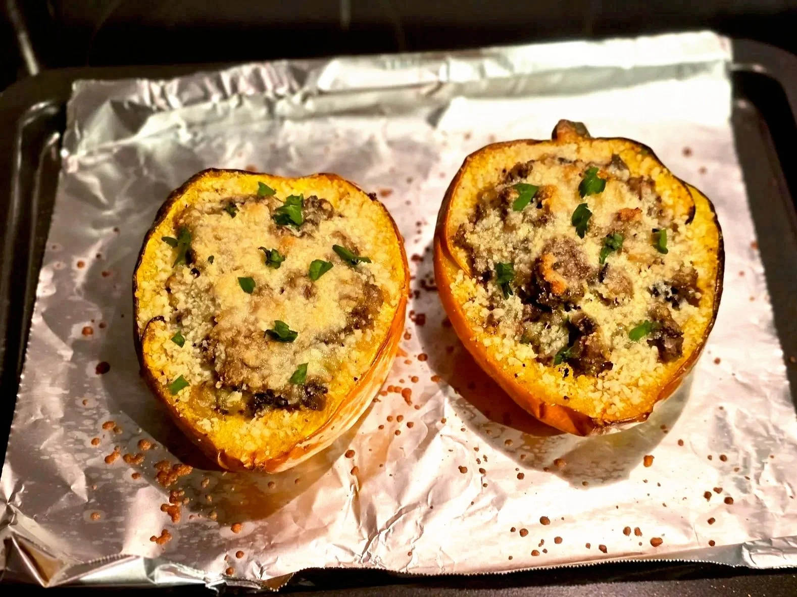 The roasted squash becomes the perfect vessel for a savory filling of ground beef and vegetables. Smoky paprika, a zing of horseradish, and the earthy fragrance of fresh sage come together for the perfect bite.