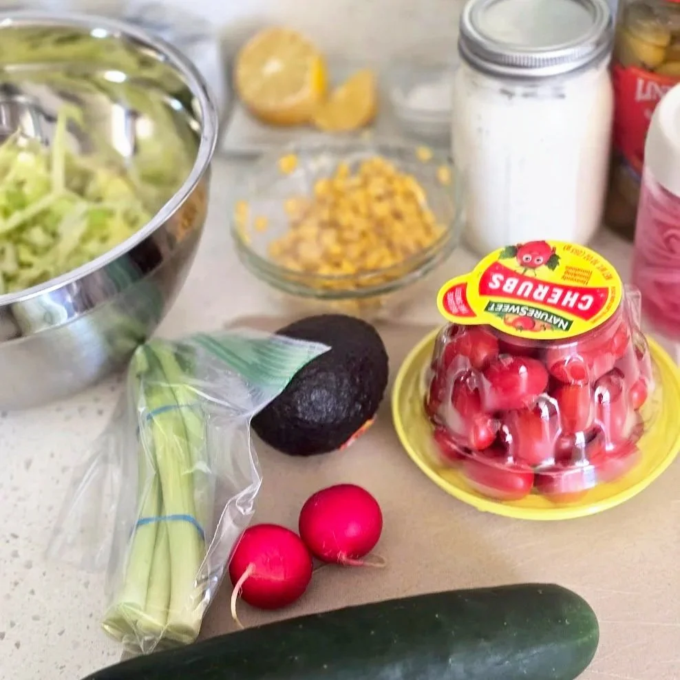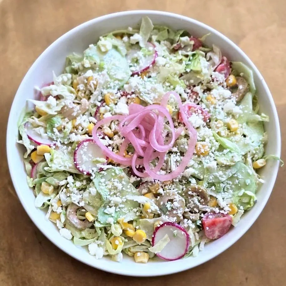 Put the lettuce, cucumber, radishes, corn, tomatoes, olives and ranch dressing in a mixing bowl and mix until the vegetables are well coated by the dressing. Top with the cheese and pickled red onion. Enjoy!
