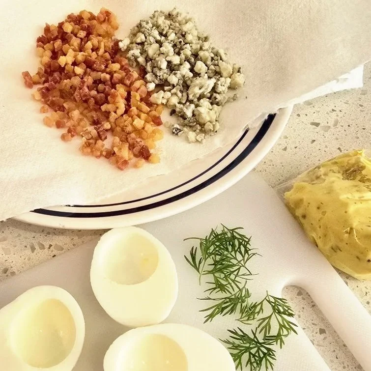 Boil and peel the eggs, slice them in half, and separate the yolks. Mix together the yolks with the mayo, mustard, blue cheese crumbles, crispy pancetta, dill, and salt and pepper. Pipe the filling back into the white egg halves, then finish with a sprinkle of pancetta and garnish with fresh dill. See more detailed instructions in the recipe card below.