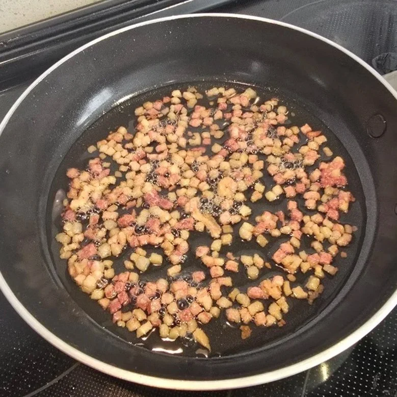 Start by dicing and cooking your pancetta. Using a small skillet on medium high heat. Stirring regularly. It will take about 5 minutes to get them crispy. When it’s done, it will look like the picture below — browned’ish.