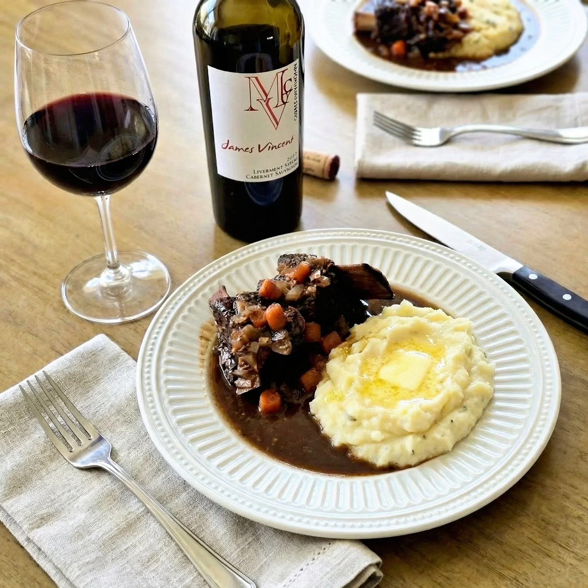 “This Livermore Valley Cabernet has full body, well-integrated tannins, and dark fruit notes such as crème de cassis and boysenberry creating an exquisite balance with the short rib’s rich flavor. Its bold structure stands up to the depth of the dish, providing a perfect compliment of tastes, textures and complexity.”
